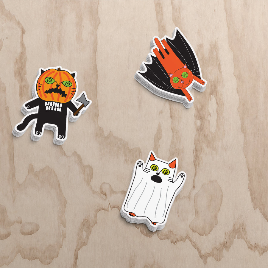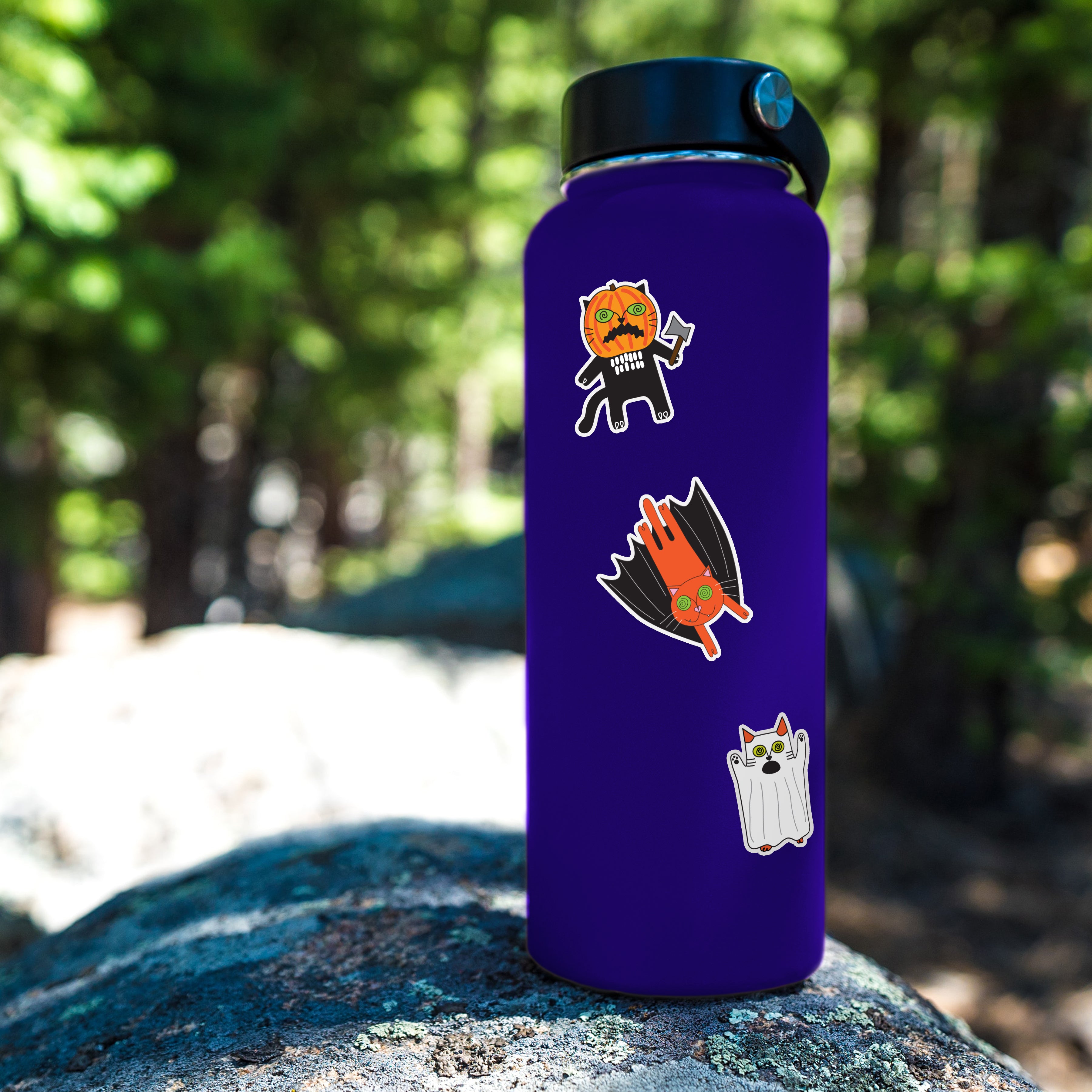 Boo! This kitty ain't afraid of no ghosts! Stick him on your water bottle if you dare...he even glows in the dark. Made from premium vinyl to withstand scratches, water, and sunlight, this high-quality sticker is perfect for both indoor and outdoor use.