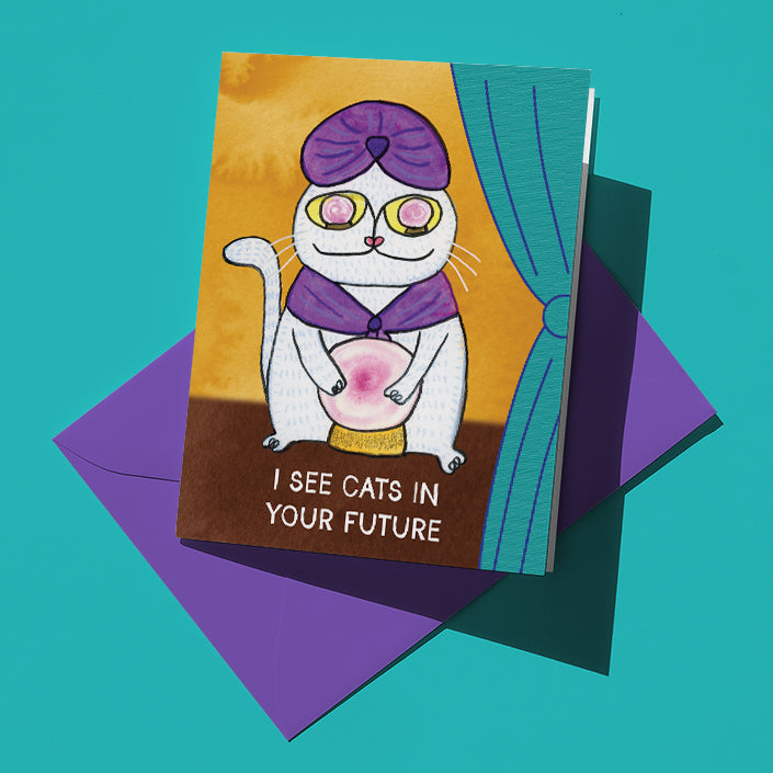 The crystal ball has spoken, and it's full of whiskers! This mystical note card features a fortune-telling cat peering into the future with playful charm. Perfect for cat lovers, new pet parents, or anyone who believes their destiny involves more feline friends.