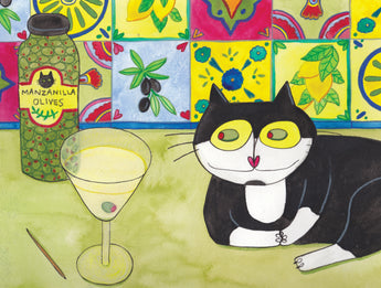 Shaken, not stirred! One cool cat keeps a close eye on his martini - and that mischievous olive - in this playful print. Printed in the USA. Unframed, 9" x 12".