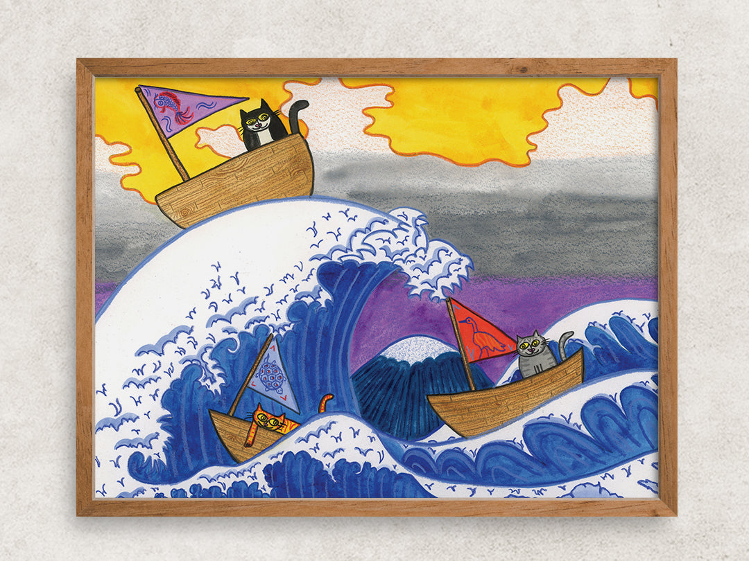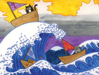 A whimsical take on The Great Wave off Kanagawa! Adventurous cats ride the waves like purr-fessional sailors in this playful Japanese-inspired cat art print. Printed in the USA. Unframed, 9" x 12".